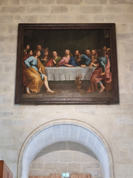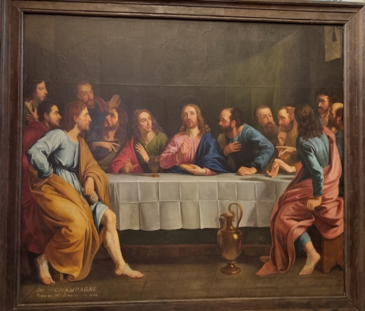 Le tableau de la Cène, précédemment « posé » sur le tableau du Testament dans l’église, est en cours de restauration depuis plusieurs mois. Les couches de peinture, de vernis, de colle qui se sont accumulées sur la toile au fil des années ne facilitent pas le travail de la restauratrice d’art. Mais nous lui faisons confiance. De l’avis général, elle nous a livré une superbe restauration du tableau du Testament. Nous ne doutons donc pas de l’éclat que retrouvera le tableau de la Cène (copie de la Cène de Philippe de Champaigne).